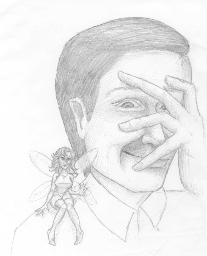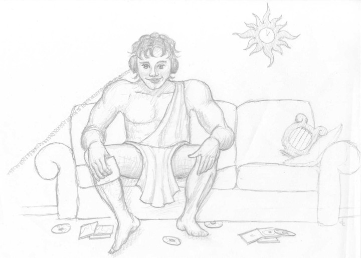 A nifty pic of Penny's erstwhile boyfriend, Apollo, enjoying Penny's CDs. Dig the stylin' 70's sunclock. Pencil sketch by my friend Cheryl Laakes. |