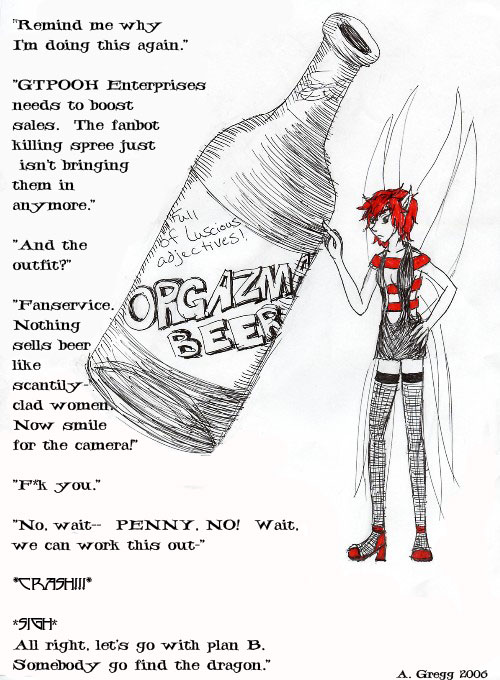 A nifty moment of Penny flogging beer by Aimee Gregg of The Ninth Plane. |