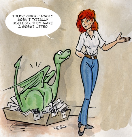 Schmookie and Penny find a proper use for tracts from everyone's favorite spittle-emitting bigot in this beautiful rendering by Diana Sasse of Antique White House |